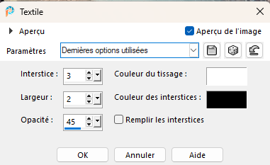 Effet de textures textile 3/2/45 (2 fois) ne pas cocher remplir les interstices