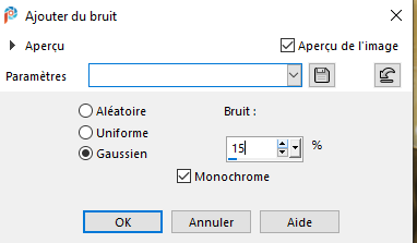 Dupliquer 2 fois renommer feux 2 et feux 3 vous placer sur le tube Happy New Year renommer le en texte 1 Dupliquer 2 fois renommer texte 2 et texte 3 On fait l'animation Fermer feux 2 et feux 3 ainsi que texte 2 et texte 3 Sur feux 1 Réglage ajouter du bruit gaussien - monochrome - bruit 15   Placez vous sur le texte faire à l'identique