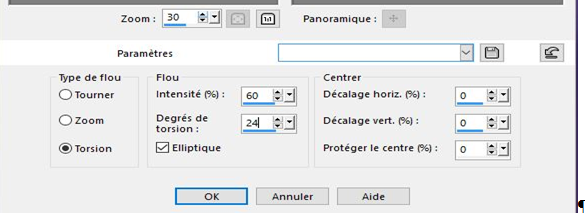 Réglages Flou radial - torsion elliptique cochée intensité 60 torsion 24 après 0/0/0